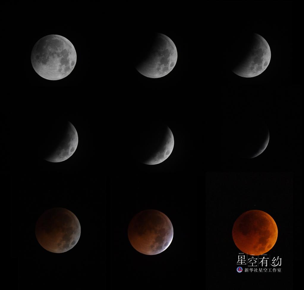 這是2018年7月28日在貴州省仁懷市拍攝的月全食過程(拼版照片)。新華社發(陳勇 攝)