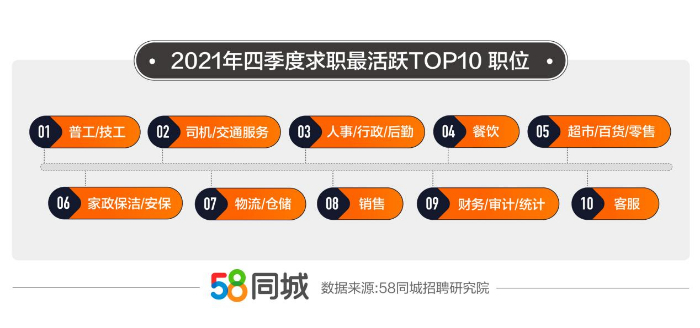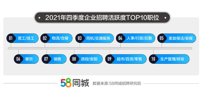 根據58同城招聘研究院數據,2021年四季度,成渝地區企業招聘需求位列前茅;武漢、長沙企業的招聘需求大量釋放,長沙較疫情前的2019年增長33.40%。從職位上看,企業招聘活躍度TOP10的職位分別為:普工/技工、物流/倉儲、司機/交通服務、人事/行政/后勤、家政保潔/安保、餐飲、銷售、質控/安防、超市/百貨/零售、生產管理/研發。