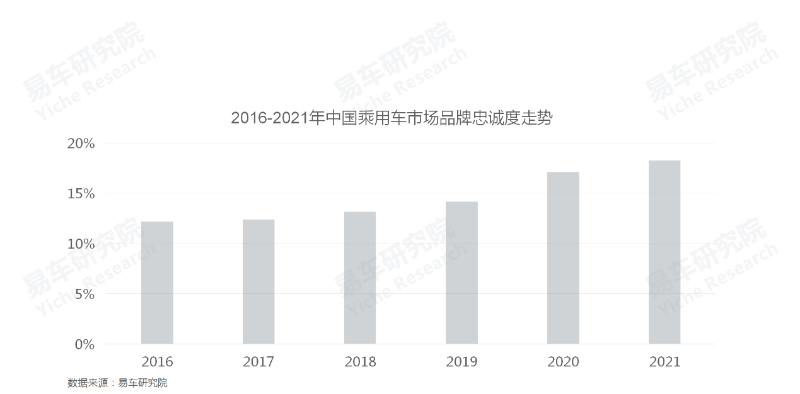 作為中國車市非商業智庫,易車研究院近幾年一直在優化方法論,做好基礎數據的儲備與提煉。2016~2021年,中國車市的品牌忠誠度一直處于上升狀態,近兩年的上升幅度更快,2021年升至18.24%,估計2022-2023年就能突破20%;
