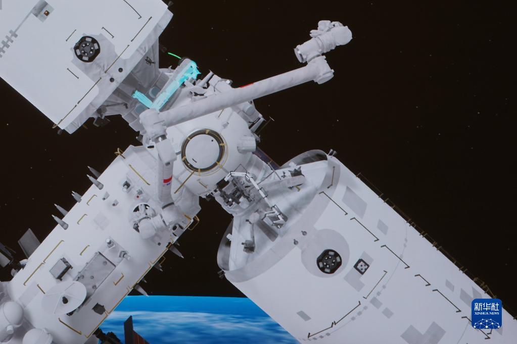 這是2022年11月3日在北京航天飛行控制中心拍攝的空間站夢天實驗艙完成轉位的模擬圖像。新華社發(孫豐曉攝)