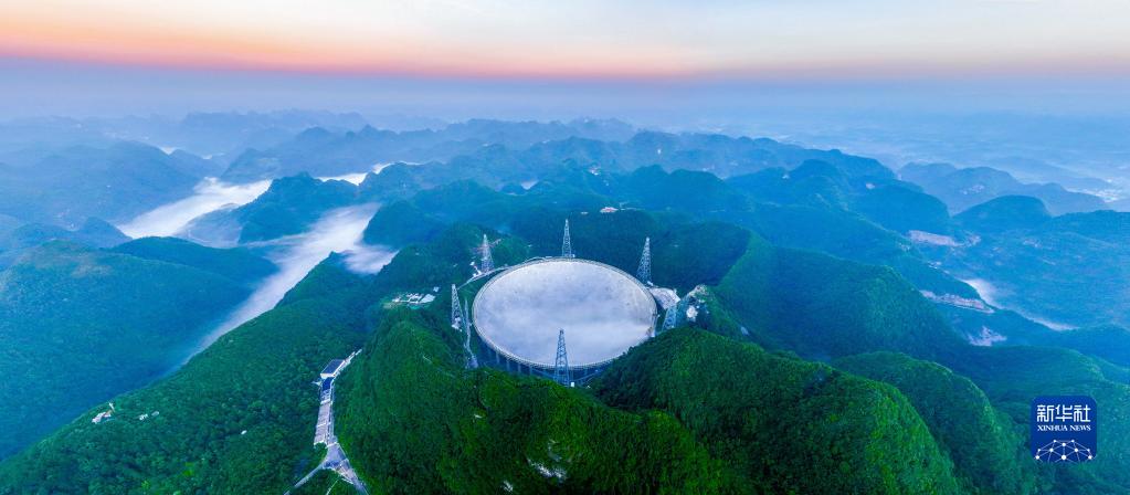 晨曦中的“中國天眼”全景(無人機照片,2022年7月25日維護保養期間拍攝)。新華社記者 歐東衢 攝