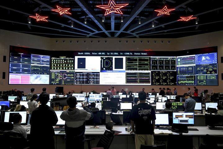 這是實驗成功后的全超導托卡馬克核聚變實驗裝置(EAST)控制大廳(2023年4月12日攝)。新華社記者 黃博涵 攝