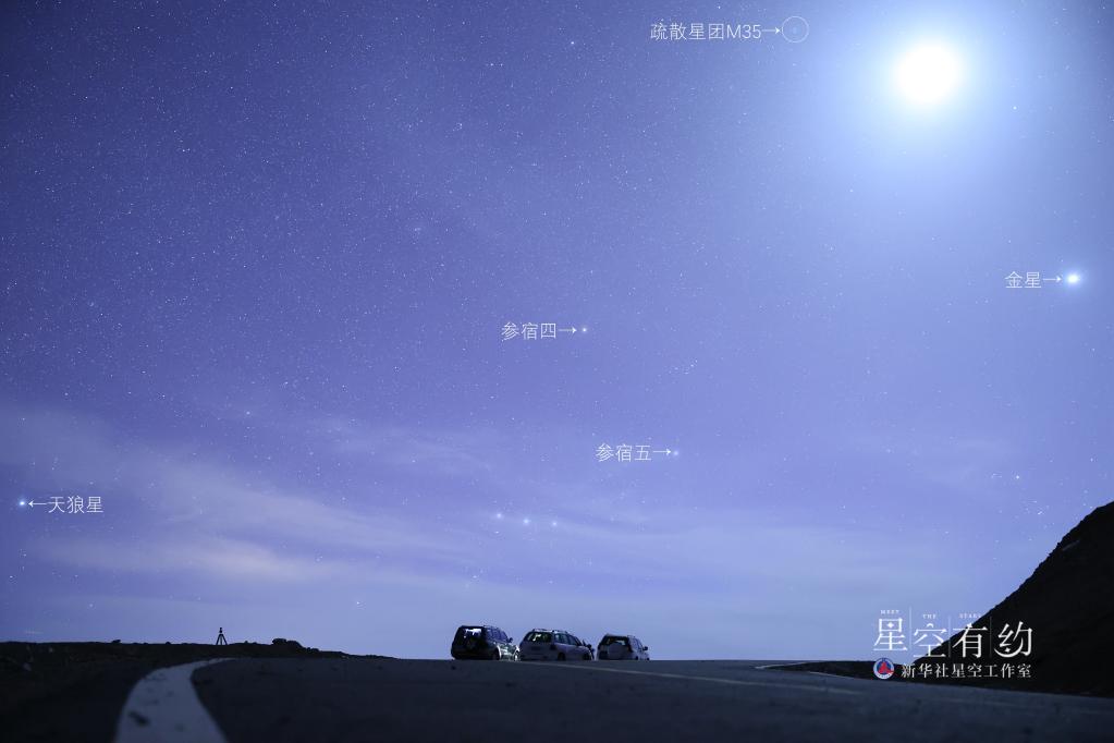 這是北京市天文攝影愛好者王俊峰2023年4月24日在新疆哈密市巴里坤哈薩克自治縣拍攝的疏散星團M35、金星、新月、獵戶座的參宿系列、天狼星等。(本人供圖)