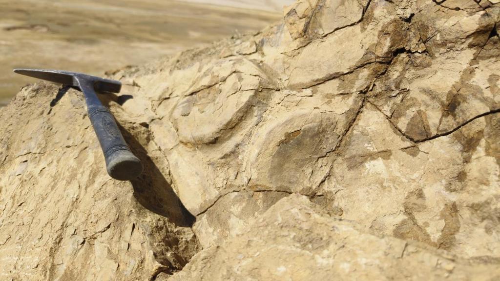 西藏定日地區三疊紀曲龍共巴組巖層中的魚龍化石錐體(圓盤狀物體)和肋骨。(中國科學院古脊椎動物與古人類研究所供圖)