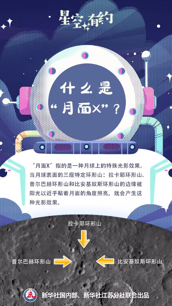 什么是“月面X”?紫金山天文臺科普主管王科超介紹,“月面X”指的是一種月球上的特殊光影效果。當月球表面的三座環形山:拉卡耶環形山、普爾巴赫環形山和比安基奴斯環形山的邊緣被陽光以近乎貼著月面的角度照亮,就會產生這種特殊的光影效果,即有類似英文字母“X”的形狀浮現在月球表面?!霸旅鎄”最早于2004年由加拿大觀測者發現和報告。此后,這一現象受到許多天文愛好者的持續關注。