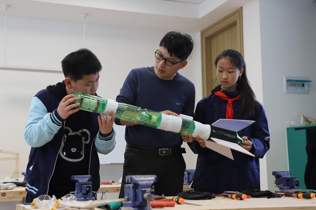 科普“網紅”王?。ㄖ校┡c孩子們一起用塑料瓶制作“火箭”。(受訪者供圖)