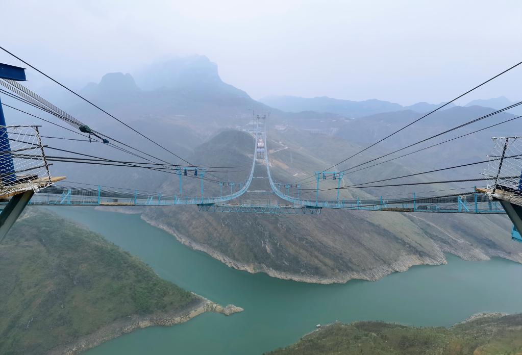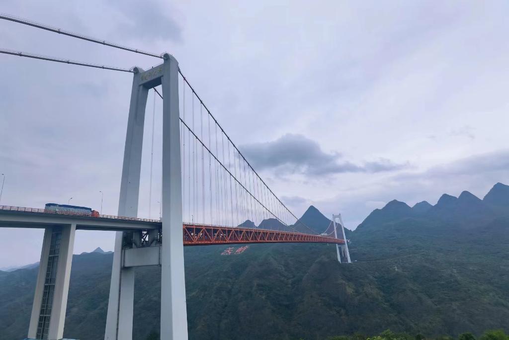作為納晴高速的重點控制性工程,牂牁江大橋橫跨貴州晴隆、普安、水城、六枝等4縣(區)交界,橋梁全長達1849米,主橋結構形式為雙塔單跨鋼桁梁懸索橋,橋面距江面最高距離380米,橋梁高度在世界百座高橋中排名第11位。
