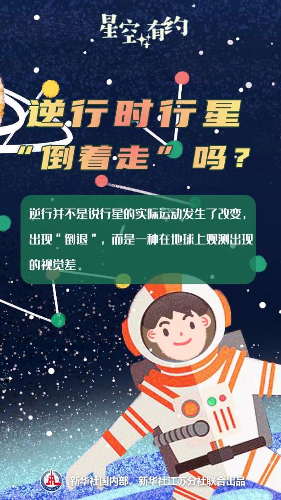 “逆行并不是說行星的實際運動發生了改變,出現‘倒退’,而是一種在地球上觀測出現的視覺差?!蓖蹩瞥f,行星視運動分為三種:順行、逆行、留。順行時,行星在天球上的運動方向為自西向東,與太陽在天球上的周年視運動方向一致。逆行時,行星在天球上的運動方向為自東向西,與太陽在天球上的周年視運動方向相反。順行逆行互相轉換時,行星在天球上的位置短時期不動,稱為留。
