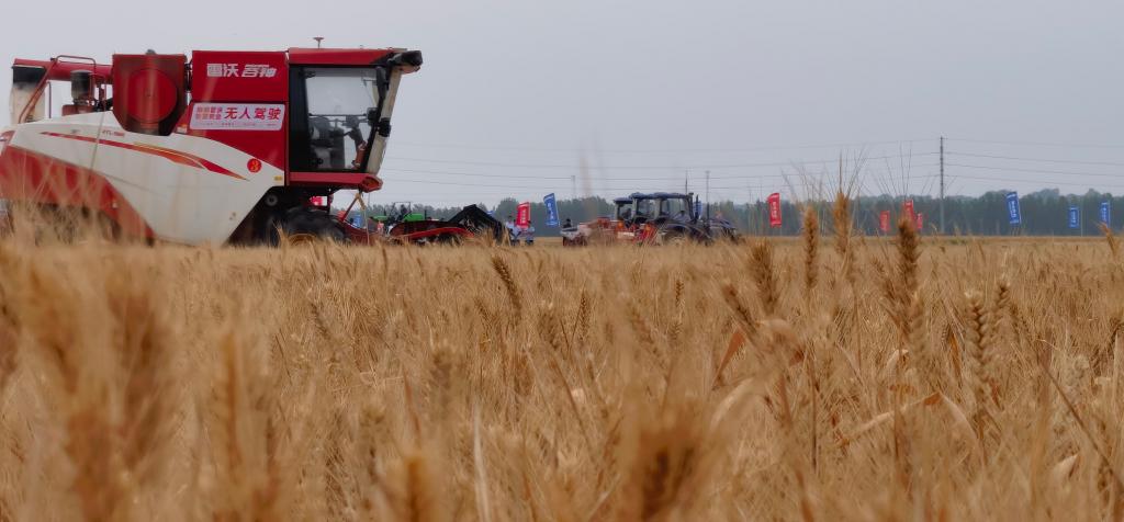 2023年中國農機推廣“田間日”活動現場,無人駕駛收割機正在收割小麥。新華社記者 葉婧 攝