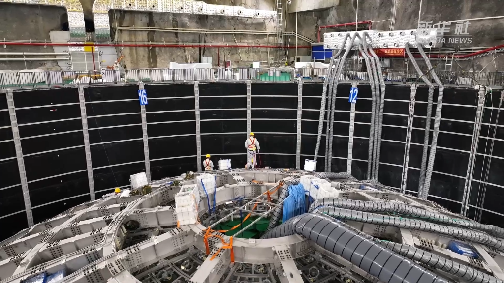 目前,地下探測器已完成不銹鋼網架安裝,正在進行有機玻璃球、液閃混制與純化設備等安裝,預計2024年建成并運行。屆時,江門中微子實驗將成為國際中微子研究的中心之一。