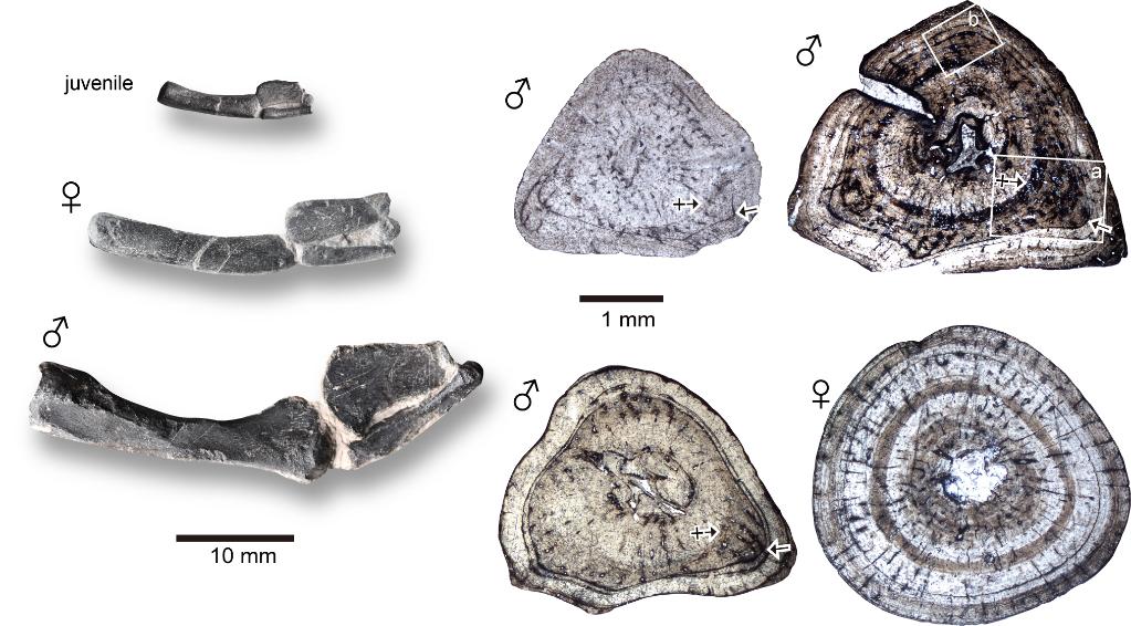 通過對比幼年個體、青春期個體及成年個體骨組織,分析骨密度和生長速率,研究團隊得出了貴州龍在青春期快速生長的結論,獲得了貴州龍青春期發育開始和終止的信息:青春期雄性個體的肱骨逐漸形成了三角形中軸截面,而雌性和幼年個體肱骨中軸截面一直保持橢圓形。