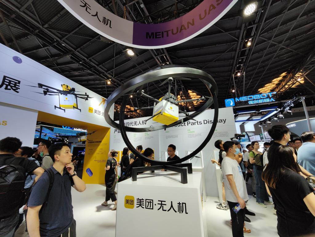 7月6日,世界人工智能大會展會現場,美團展示的第四代送餐無人機新機型。新華社記者 楊有宗 攝