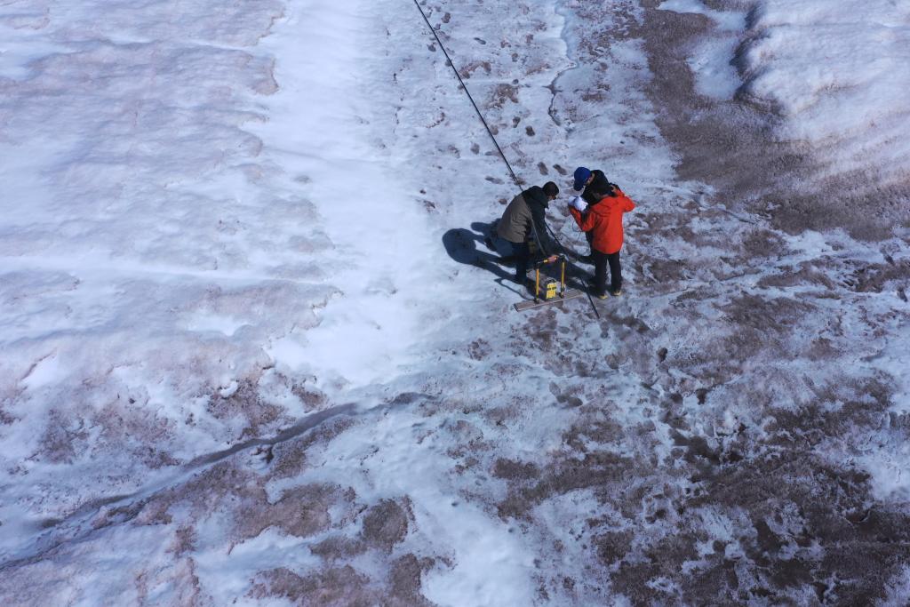 7月27日,范越(左一)和董士琦(左二)在長江源區的冬克瑪底冰川上使用地質雷達探測冰川厚度(無人機照片)。新華社記者 陳杰 攝