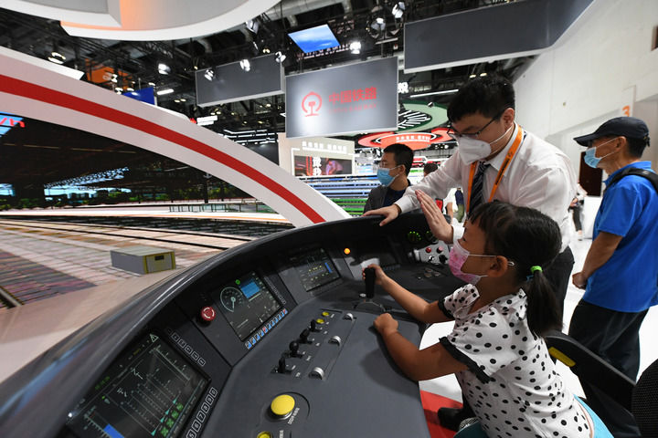 小朋友在2022年中國國際服務貿易交易會國家會議中心展館體驗京張高鐵動車組模擬駕駛臺(2022年9月3日攝)。新華社記者 任超 攝