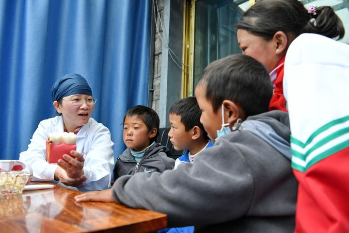 在西藏浪卡子縣普瑪江塘鄉,上海市徐匯區牙病防治所的醫生蘇紅如向小朋友科普牙齒保健知識(2023年7月8日攝)。新華社記者 張汝鋒 攝