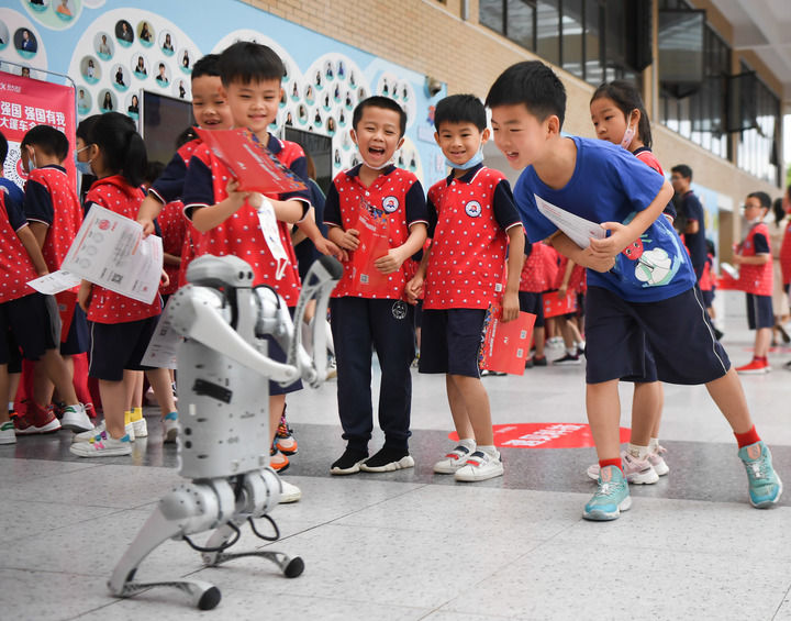 在湖南長沙華夏實驗學校舉辦“科技大篷車”進校園活動上,學生們在和機器狗互動(2022年6月22日攝)。新華社記者 薛宇舸 攝