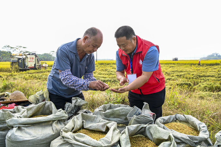 在廣西興業縣石南鎮鳳山村的稻田里,科技特派員(右)在查看晚稻品質(2022年11月10日攝)。新華社記者 曹祎銘 攝