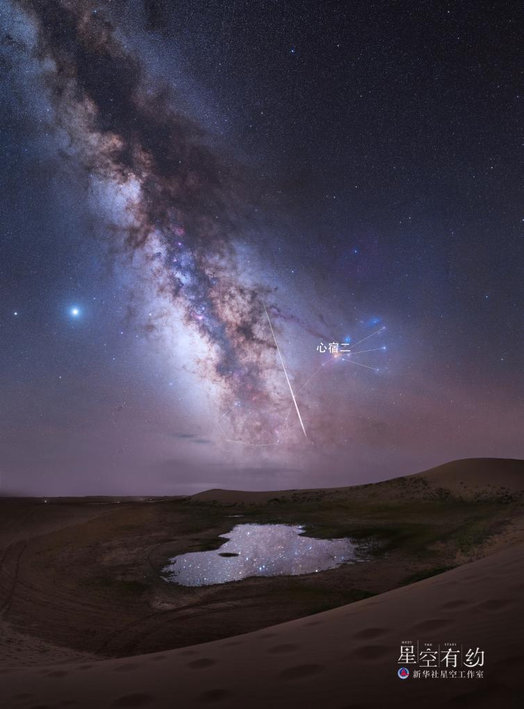 中國天文學會會員、天津市天文學會理事賴迪輝介紹,天蝎座是一個著名的黃道星座,是夏季南部天空的標志性星座,形象鮮明又醒目。心宿二,即天蝎座α星,屬東方蒼龍七宿的心宿,即龍心。它是一顆紅超巨星,視星等接近1等,在全天恒星亮度排名中列第15位,發出暗紅色光芒。