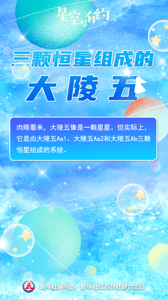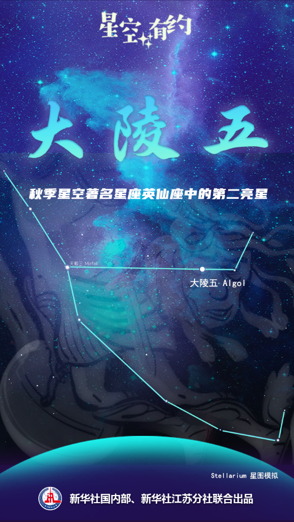 中國科學院紫金山天文臺科普主管王科超說,在人們肉眼看來,大陵五只是秋季東北方向天空中一個遙遠的亮點,像是一顆星星。但實際上,它是由大陵五Aa1、大陵五Aa2和大陵五Ab三顆恒星組成的系統。這三顆恒星被引力“束縛”在一起,共同組成大陵五這個三合星系統。系統之中三顆星的相對位置還會發生變化,并影響到大陵五的亮度。天文學上把這種亮度時常變化的恒星或恒星系統稱作變星。大陵五也是秋季星空著名星座英仙座中的第二亮星。
