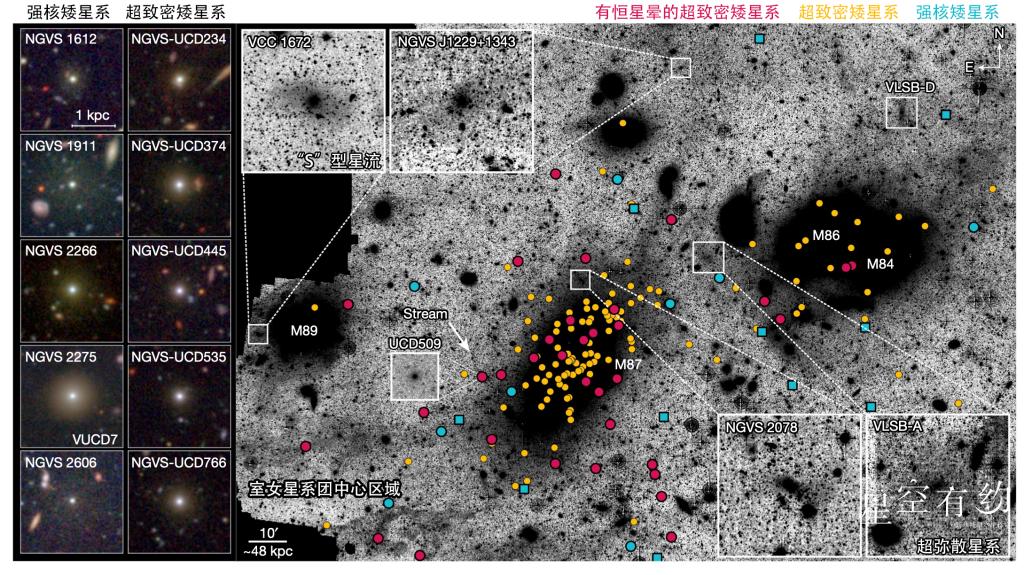 圖為部分強核矮星系和超致密矮星系的光學圖像,以及其在室女星系團中心區域的空間分布。(受訪者供圖)