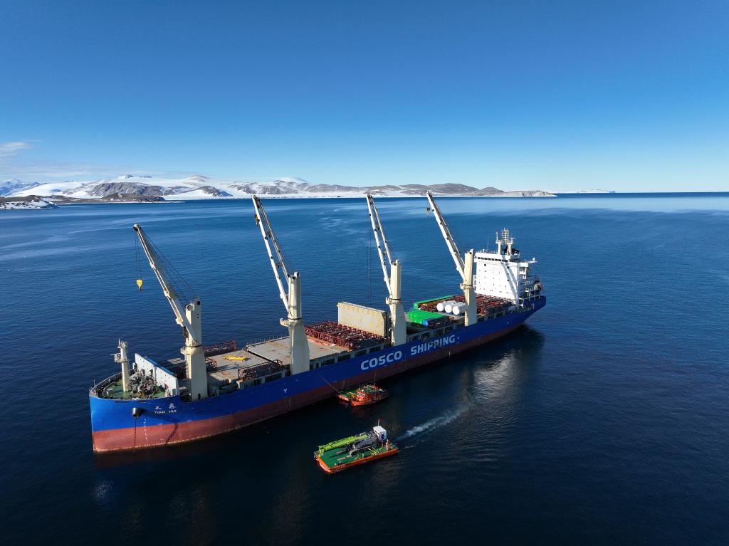 2023年12月8日,“天惠”輪在卸載建站物資(無人機照片)。執行中國第40次南極考察任務的“雪龍2”號和“天惠”輪,正在羅斯海新考察站開展卸貨作業和人員登陸工作。新華社發(王海楠攝)