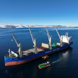 長城灣,海面波瀾不興。駁船載著物資,從“雪龍”號駛向長城站碼頭。