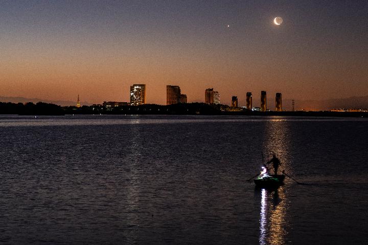 天津星空攝影愛好者劉慶2023年3月24日在天津市區拍攝的金星伴月。(本人供圖)