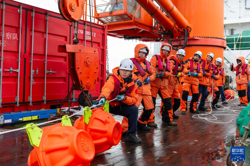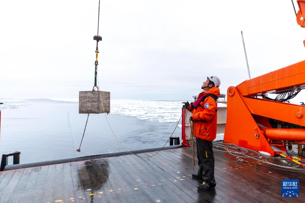 北京時間1月6日,考察隊在布放潛標。北京時間1月6日,中國第40次南極考察隊在阿蒙森海成功布放深水生態潛標,這也是中國首次在極地布放生態潛標。新華社記者 周圓 攝