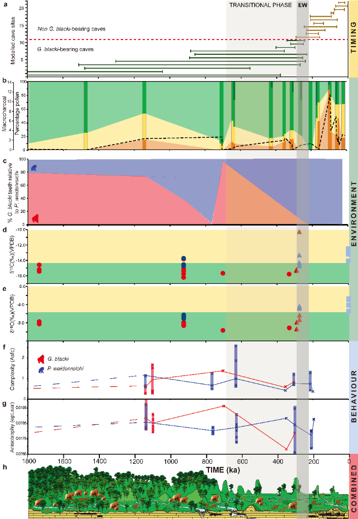 在此基礎上,研究團隊將6種獨立的測年技術應用于含化石堆積物和化石本身,獲得157個放射測量測年結果。這些年代數據與孢粉、哺乳動物群以及牙齒穩定同位素、微量元素、微磨痕等8個方面的分析結果相結合,全方位展現了步氏巨猿滅絕的前因后果——