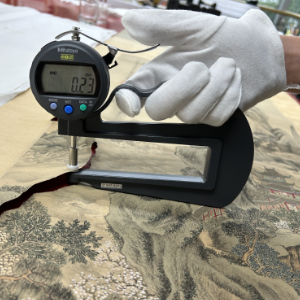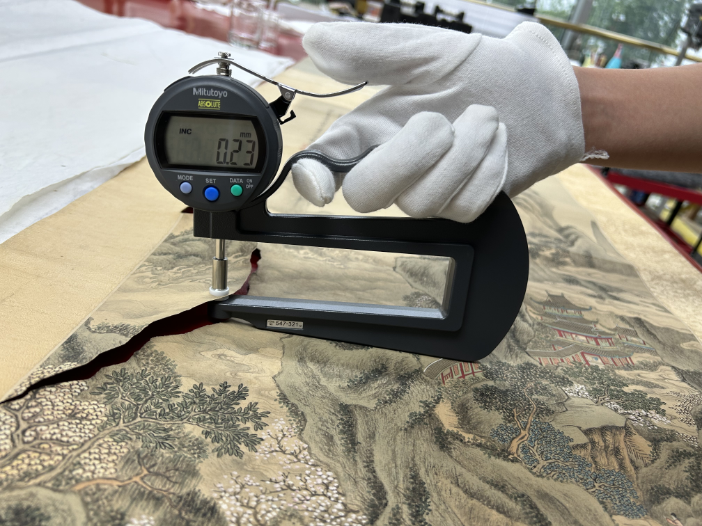 修復前,對《趙垓山水圖軸》測試厚度。(受訪者供圖)