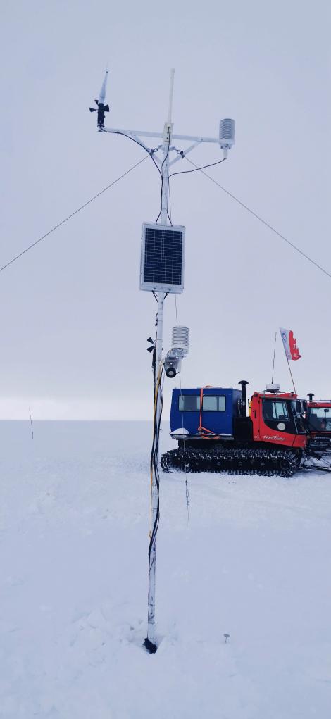 中國第40次南極考察隊員在麒麟冰下湖的冰面架設氣象站。新華社發(李傳金攝)