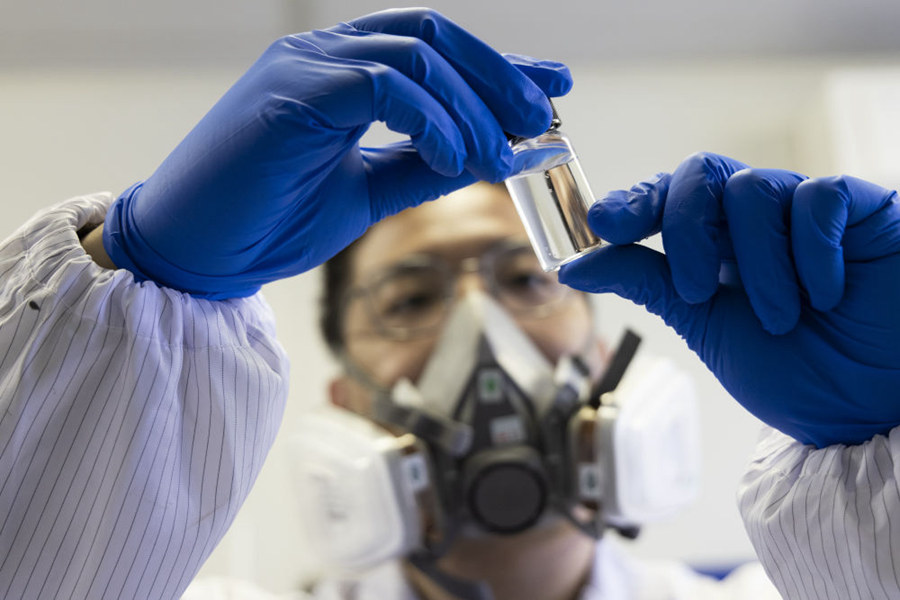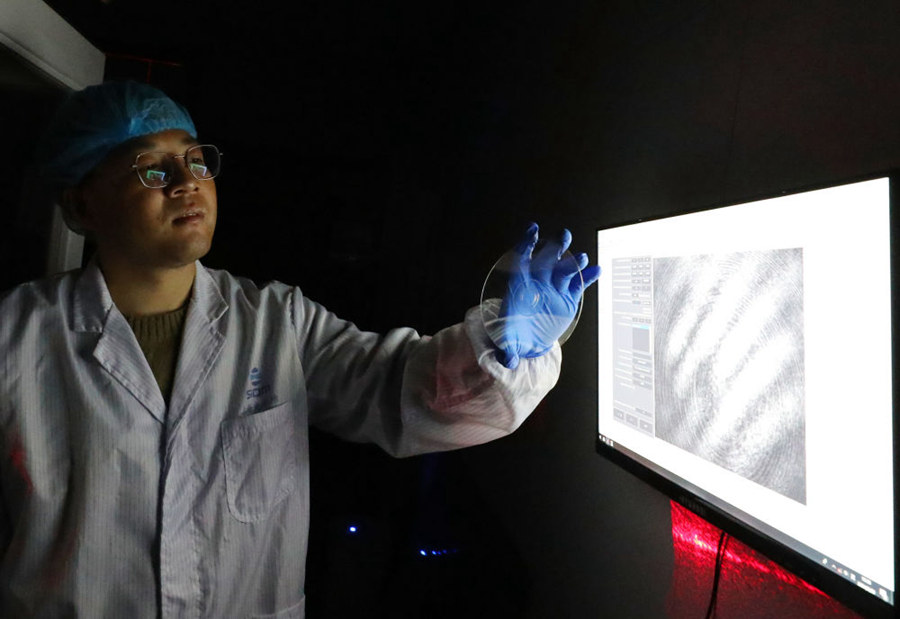 趙苗博士在上海光機所材料實驗室內觀察實驗材料(2月29日攝)。