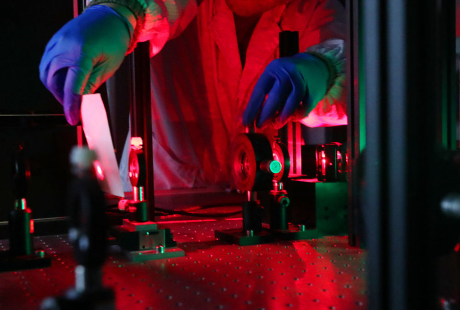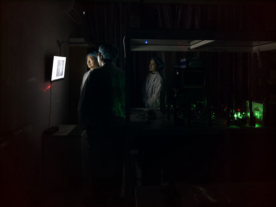 阮昊研究員在上海光機所光學實驗室觀察寫入試驗進展(2月29日攝)。