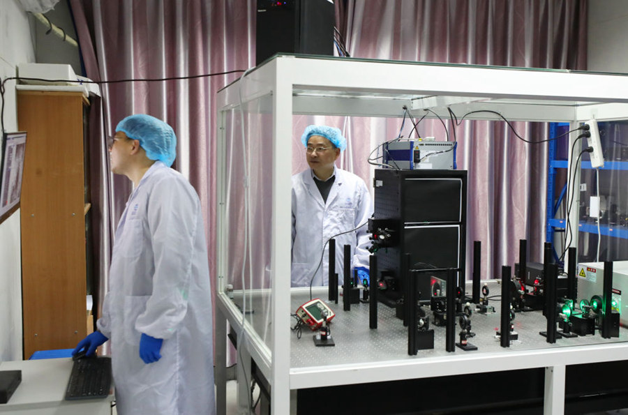 研究團隊在上海光機所光學實驗室,利用國際首創的雙光束調控聚集誘導發光超分辨光存儲技術做寫入試驗(2月29日攝)。