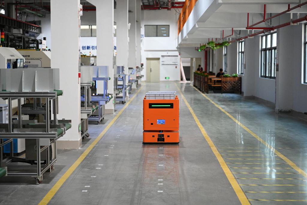 在福建泉州南安市九牧智能馬桶“綠色黑燈燈塔工廠”,5G自動導引運輸車在車間進行運輸作業。新華社記者 周義 攝