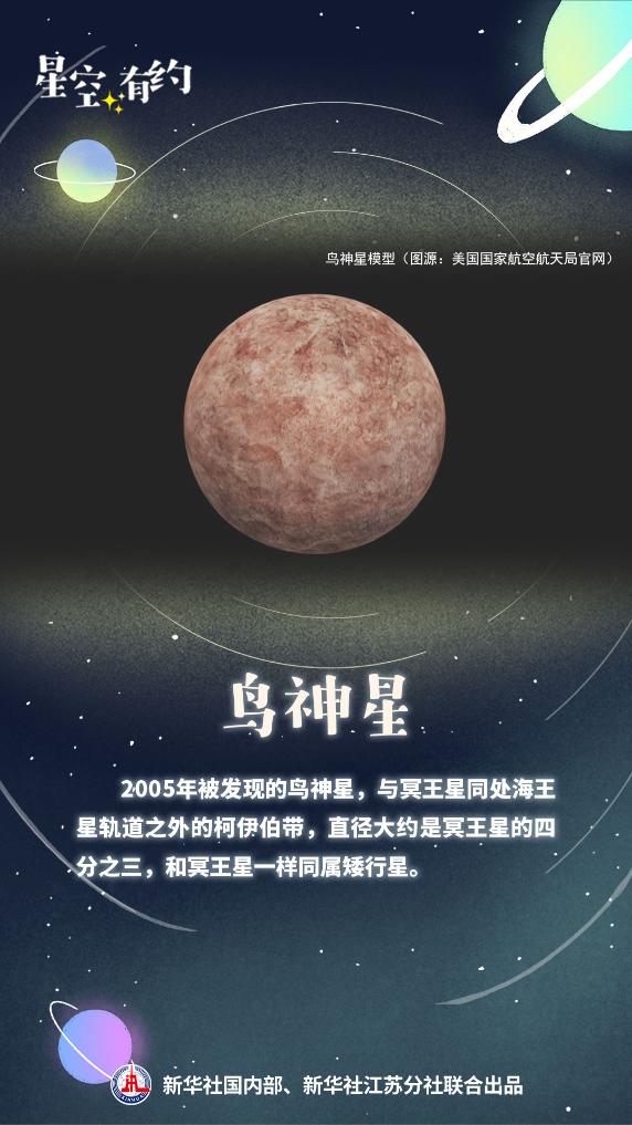 2005年被發現的鳥神星,與冥王星同處海王星軌道之外的柯伊伯帶。它的直徑大約是冥王星的四分之三,距離太陽約52個天文單位。和冥王星一樣,鳥神星也屬于矮行星。在柯伊伯帶的矮行星中,鳥神星的亮度位居第二,僅次于冥王星。