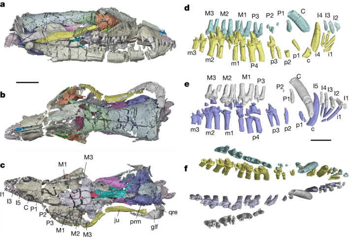在第一篇論文中,研究人員對內蒙古道虎溝中侏羅紀時期(1.68億年至1.64億年前)的兩個標本進行了研究,建立了一個蜀獸新屬種“周氏近柱齒獸”,并根據牙齒研究的系列證據提出了一種新的解釋:蜀獸的假磨楔齒與南方磨楔齒類無關,而與另一種已滅絕的哺乳動物的臼齒模式同源。該研究對單孔類的起源提出了新的觀點,改寫了哺乳動物生命樹早期演化的結構。