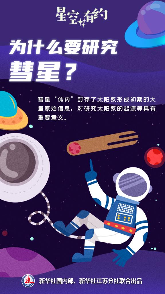 除了觀賞,彗星對天文工作者來說具有重要研究價值?!板缧恰w內’封存了太陽系形成初期的大量原始信息,對研究太陽系的起源等具有重要意義。彗星內部含有大量易于揮發的水冰和氣體冰,受太陽輻射等影響,它們升華并裹挾著大量塵埃從彗星表面噴發,形成巨大的彗發和彗尾。這種噴發特征被稱為彗星的活動性特征,結合軌道數據,天文學家可以推演出太陽系早期的形成環境和演化規律?!蓖蹩瞥f。