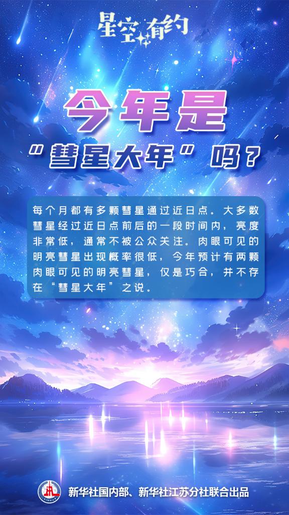 中國科學院紫金山天文臺科普主管王科超說,目前被發現的彗星數量超過4500顆。事實上,每個月都有多顆彗星通過近日點,如212P/NEAT彗星將于4月25日通過近日點,C/2024 A2 (ATLAS)彗星將于29日過近日點。大多數彗星過近日點前后的一段時間內,亮度非常低,通常不被公眾關注。肉眼可見的明亮彗星出現概率很低,今年預計有兩顆肉眼可見的明亮彗星,僅是巧合,并不存在“彗星大年”之說。