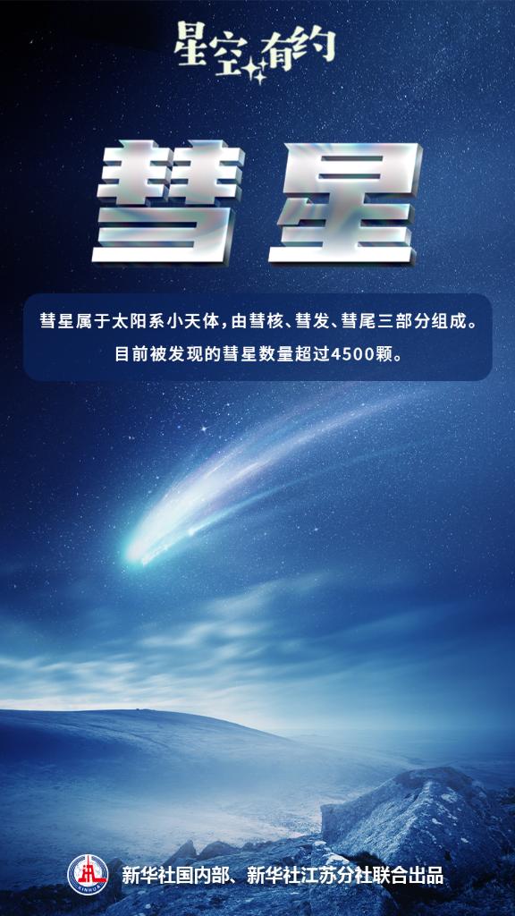 “彗星屬于太陽系小天體,它是由水、氨、甲烷等凍結的冰塊和許多固體塵埃粒子組成的‘臟雪球’?!蓖蹩瞥f,接近太陽時,由于溫度增高、輻射增強,彗星物質升華,在彗核周圍生成朦朧的彗發和由稀薄物質構成的彗尾,狀如掃帚。彗尾長度最長可能達幾億公里。