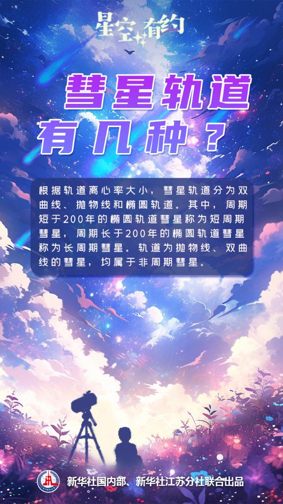 對公眾而言,有些彗星幾年或幾十年“見一面”,而有些彗星則屬于“一旦錯過就不再”,這主要與彗星的軌道有關。王科超解釋說,根據軌道離心率大小,彗星軌道分為雙曲線、拋物線和橢圓軌道。其中,周期短于200年的橢圓軌道彗星稱為短周期彗星,例如大名鼎鼎的哈雷彗星,軌道周期約為76年;周期長于200年的橢圓軌道彗星稱為長周期彗星,有些彗星的軌道周期長達數萬年。軌道為拋物線、雙曲線的彗星,均屬于非周期彗星,他們通過近日點后就離開太陽系,不再回來。不過,受其他天體引力攝動或噴發活動等因素的影響,彗星軌道類型也可能發生轉變。