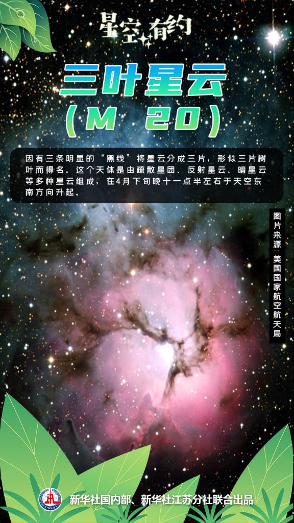 花兒少不了葉子的襯托。位于人馬座的三葉星云(M 20),因有三條明顯的“黑線”將星云分成三片,形似三片樹葉而得名。這個天體是由疏散星團、反射星云、暗星云等多種星云組成,在4月下旬晚十一點半左右于天空東南方向升起。