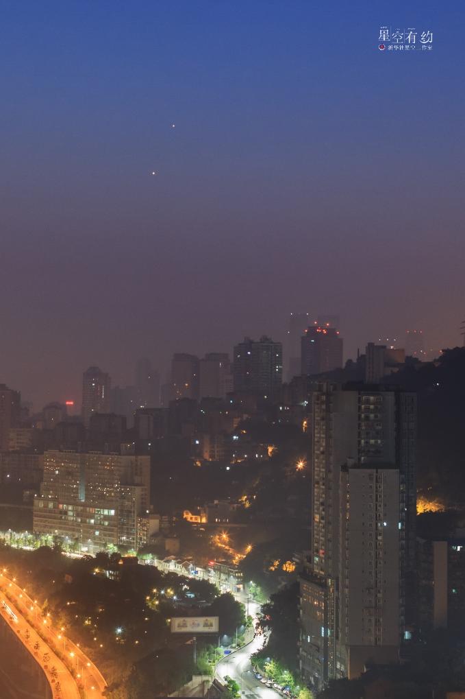 這是2014年8月20日在重慶渝中區拍攝的金(左下)木(右上)極近。(重慶星空攝影愛好者戴建峰 攝)