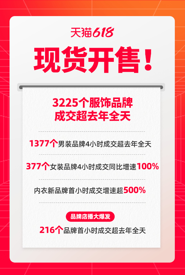 5月20日晚8點,天貓618現貨開賣,服飾行業3225個服飾品牌開賣4小時超去年全天。