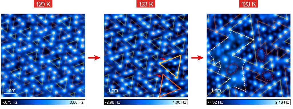 圖為隨著溫度升高冰表面預融化過程的原子級分辨成像。(受訪者供圖)