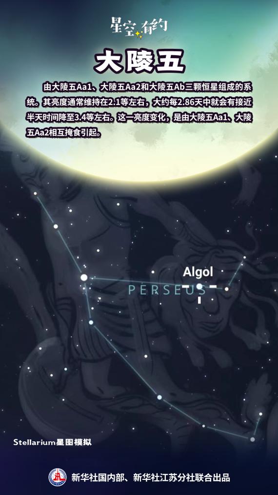 食變星中的“明星”,有英仙座中的第二亮星大陵五。王科超介紹,大陵五是由大陵五Aa1、大陵五Aa2和大陵五Ab三顆恒星組成的系統。其亮度通常維持在2.1等左右,大約每2.86天中就會有接近半天時間降至3.4等左右。這一亮度變化,是由大陵五Aa1、大陵五Aa2相互掩食引起的。