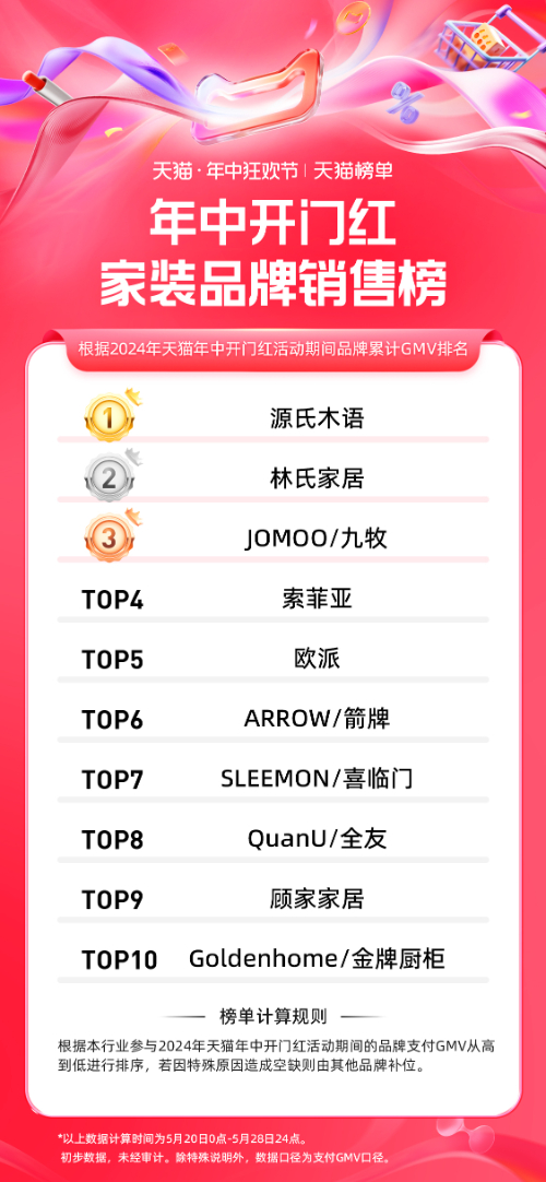 以下為各行業,天貓618第一階段(5.20-5.28)品牌成交排行榜: