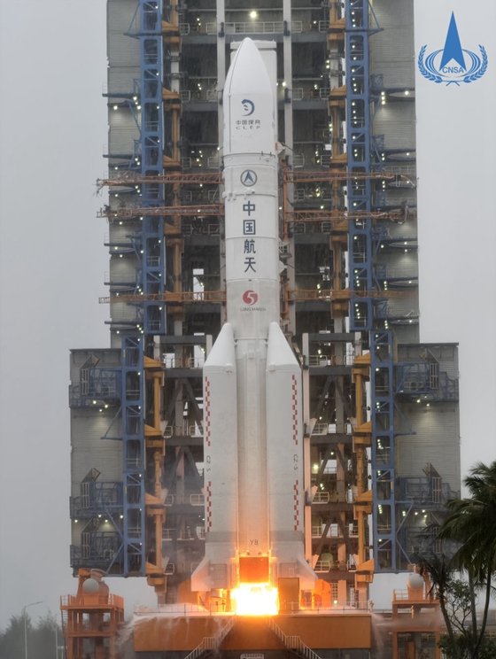 2024年5月3日17時27分,嫦娥六號探測器由長征五號遙八運載火箭在中國文昌航天發射場發射,之后準確進入地月轉移軌道,發射任務取得圓滿成功。新華社發(國家航天局供圖)