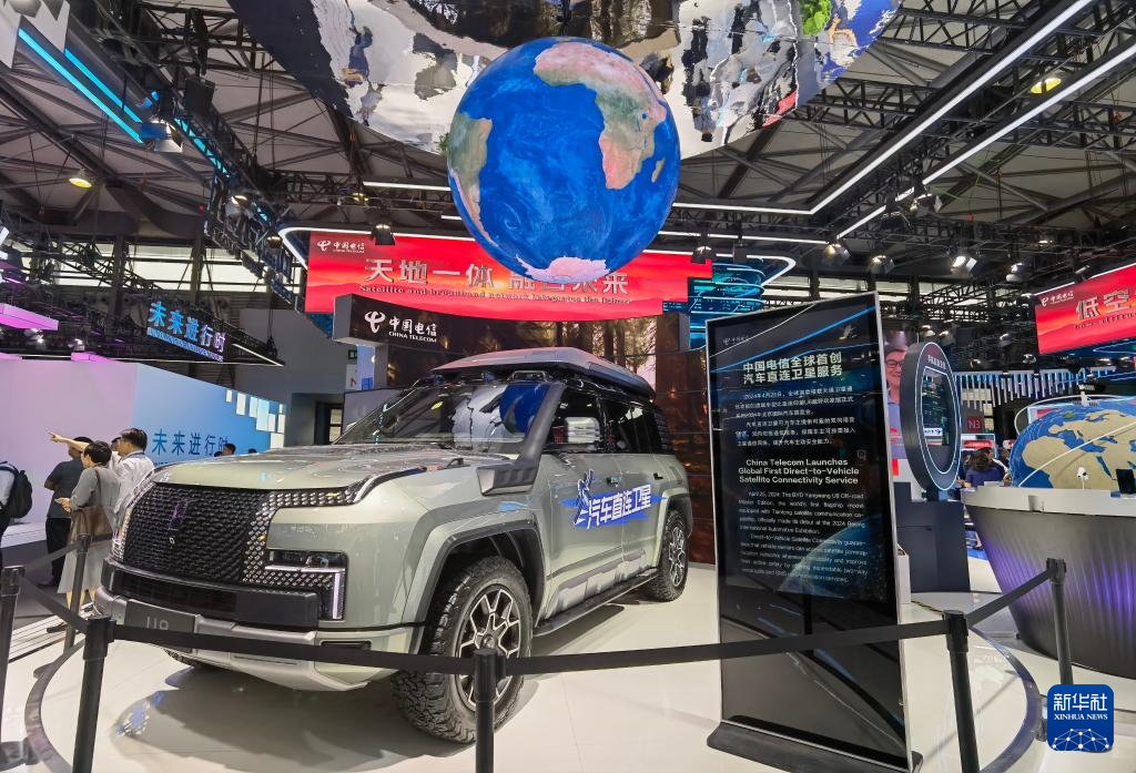 6月26日在中國電信展臺拍攝的汽車直連衛星服務介紹。