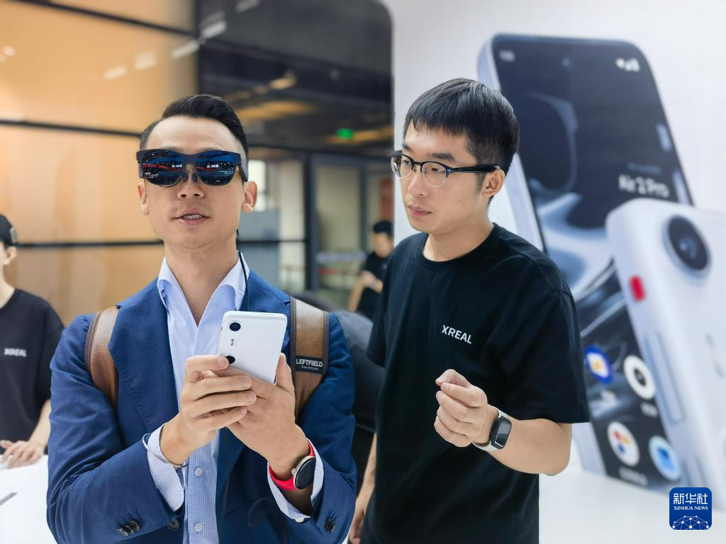 6月26日,在XREAL展臺,觀眾(左)體驗AR眼鏡產品。